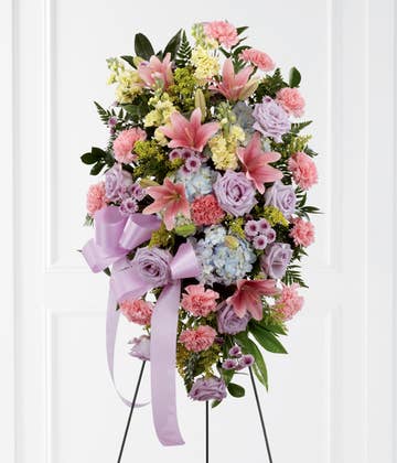 Express your condolence thoughts to the family of the deceased with this all-red funeral flower standing spray featuring striking freshly cut carnation, rose, Irish bell, and blooming favorites. Gracefully accented with greenery, this affordable arrangement exudes beauty and peace at any visitation, memorial, or wake service. Sending a bereavement gift for the family is a thoughtful way to express your admiration for the deceased. You can schedule sympathy gifts for today, tomorrow or well ahead of time.