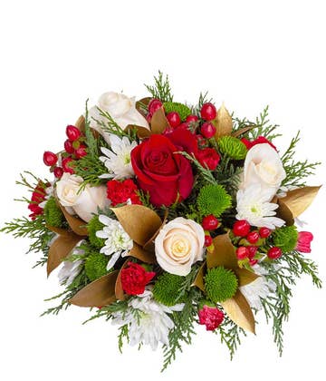 Send love this holiday season with this mixed bouquet of beautiful deep crimson rose and carnation flowers hand arranged with delicious candy canes. This is a wonderful pairing of one of our top-selling flower deliveries with tasty sweets, all Christmas-themed and delivered by hand inside a glass container. Long stemmed romantic florals are freshly cut and dramatically arranged for a Christmas arrangement and centerpiece that will turn heads no matter where it's housed. Sending one of these floral and sweets bouquets with satisfy their sweet tooth and their need for winter beauty.