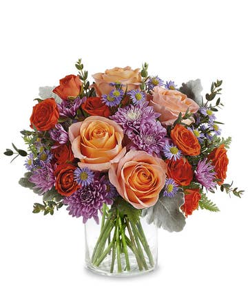 In the spirit of Easter, this enchanting bouquet is a delightful ode to the season's joy and renewal. With soft peach roses, pink alstroemeria, and miniature carnations, it embodies the freshness of spring. Enhanced by a stem of regal purple monte cassino asters and accented with dusty miller and seeded eucalyptus, this bouquet is a beautiful expression of Easter blessings, sure to brighten any celebration.