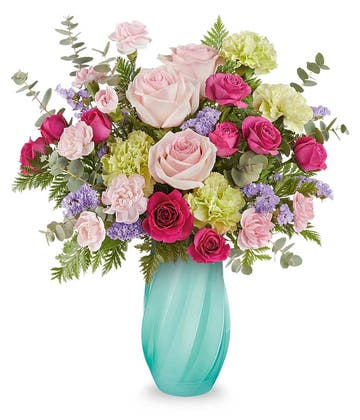 The enchanted garden flower bouquet is a beautiful mix of freshly cut blooms blurring together in a beautiful arrangement. Pale carnation blossoms and alstroemerias are hand-arranged and delivered with lilac mum, purple statice, leatherleaf fern, and more for a fresh from the garden look. Presented in a square cubed vase, this pastel floral centerpiece of beautiful spring-inspired flowers evokes pure joy. Sending someone a smile is moments away.