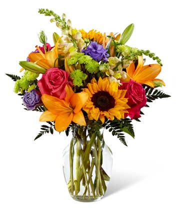Elegance, Refinement, and Autumn are exemplified in this beautiful sunflower bouquet. Stunning sunflowers, rustic mums, and vibrant lilies are arranged in a beautiful seasonal vase to complete a look that is both modern and timeless.