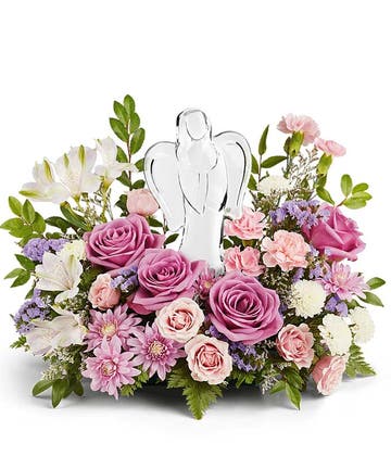 This bouquet is an gorgeous arrangement with an elegant pop of color. Lavender roses, white alstroemeria, lavender lisianthus and larkspur with white chrysanthemums. Send your loved ones this pastel lavender beauty for any occasion.