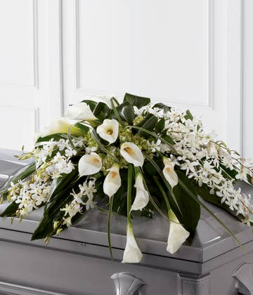 Express your deepest sympathies with a floral funeral arrangement that offers serenity and peace with beautiful soft lavender colors. Carnations, larkspur, and roses, which are accented with green cymbidium orchids and fuji mums, come together for an elegant touch. Please note that the arrangement does not include urn.
