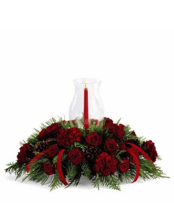 This modernized bouquet stays true to its name! Beautiful details including red ornament balls, Douglas fir and variegated holly are mixed with bright green button chrysanthemums in a jolly red cube vase. Lush roses and carnations add to the refreshing floral splendor.