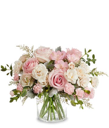 Celebrate Mom with a bouquet that’s soft, graceful, and full of heartfelt beauty. This elegant arrangement features classic pink roses paired with delicate ivory alstroemeria and rich purple cushion poms, creating a lovely balance of color and texture. Accented with fresh greenery, each bloom comes together in a garden-inspired design that feels both timeless and uplifting. Thoughtful and full of charm, it’s a beautiful way to show your love and appreciation on Mother’s Day.