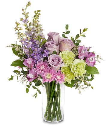 You have to agree, this pastel and poised presentation of floral fabulousness is certainly breathtaking. Express the perfect sentiments for any occasion with this lovely mixed bouquet of pastels. Your family, friend, coworker or whomever you're gifting will say "WOW"! This thoughtful combination of light purple rose, pale pink carnation and waxflower is hand-arranged and delivered in a classic clear glass vase with ribbon.