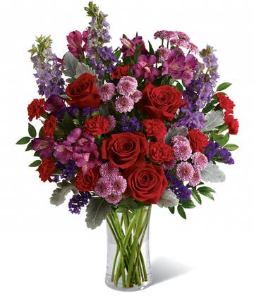 Celebrate a special person in your life with this pink pastel flower bouquet that's simply precious. Overflowing with pink and purple florals, your recipient will be smiling for days. This arrangement and rose and carnation floral centerpiece will brighten up any room, home or office space! Send someone flowers today, and let them know you're thinking of them fondly.