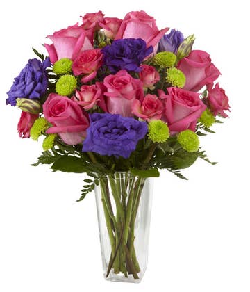 This pristine purple flower bouquet evokes a celebration of love, peace and celebration. It's a gorgeous floral present that will make your recipient relish in happiness at the thought of someone thinking about them. Make a loved one's day today by sending them this precious display. In this beautiful arrangement, rose and lily blossoms are mixed with chrysanthemum and pom blooms and then hand-delivered by a licensed florist. A flowers centerpiece is great for a birthday, anniversary, or just because gift delivery. Container may vary depending by local florist's availability. It's a wonderful idea for Valentine's Day flower delivery too!