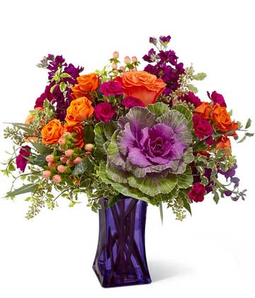 Show your appreciation with this stunning luxury dark-purple flower bouquet! Overflowing with mixed rose, carnation, chrysanthemum, and cute waxflowers; your special someone will feel like they're receiving an award. Sending them this arrangement will clearly express your wishes. Perfect for the changing seasons, this premium centerpiece will brighten anyone's day. Send it for a birthday, to say I miss you, or just because. Measures around 14 inches wide by 14 inches high. Size will vary slightly by local florist.