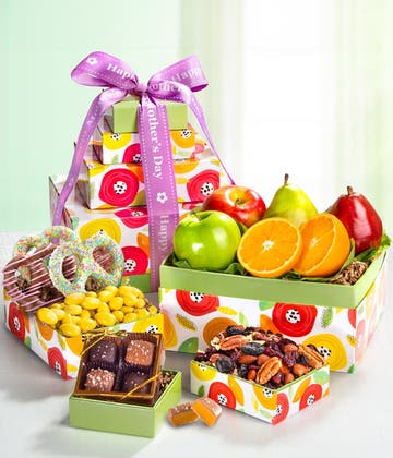For a gourmet Mother's Day treat, consider our "Savory Delights" gift basket, featuring a delectable array of flavors to tantalize her taste buds. Inside, she'll discover a selection of fresh fruits including D'Anjou Pears, Crimson Red Pear, Braeburn Apples, Granny Smith Apple, Bosc Pear, Navel Oranges, Mandarins, and a seasonal fruit. Accompanying these delights are savory indulgences such Artichoke Cheese Dip, Olli sliced Salami, Sea Salt, and Partners Olive Oil Sea Salt Crackers. Finished with a "Happy Mother's Day" ribbon, this basket is a perfect way to show your appreciation for Mom's savory side.