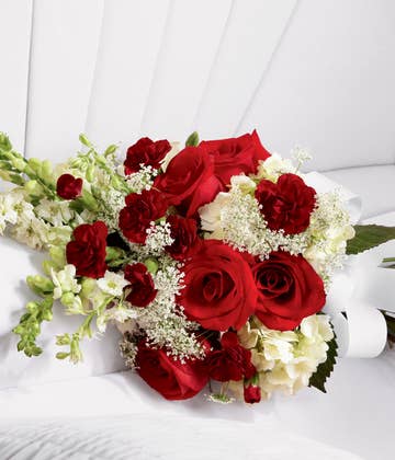 Offer comfort and serenity during trying times with this elegant floral casket spray. Cream roses are hand-arranged with white carnations, gladioli, and stock for a tender expression of love and sympathy.