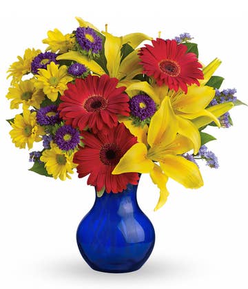 Your recipient will be delighted with this dramatic and artistic mixed orange flowers bouquet! Orange lilies, roses, and burnt-orange alstroemeria are artfully hand arranged with yellow mums, solidago, and assorted greens for a flower centerpiece that's sure to captivate your special recipient's full attention. Warm seasonal floral colors of Fall blooms are used creatively within this mixed arrangement that's hand delivered in cool blue glass vase. Evoking memories of lovely Fall evenings, your blooming gift is more than just an elegant present, it's an experience.