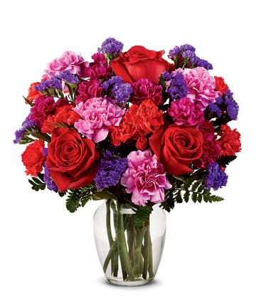 Express your love and passion for your sweetie with the stunning floral display of blush colored lily, dark-red carnation and rose blooms, and coral peruvian lilies. Send this flower bouquet for a delightful and affordable gift that comes in a beautiful vase and spreads happiness wherever it sits. An excellent choice for any delivery occasion, this mixed arrangement is a fun blending of summer and spring elements and colors.