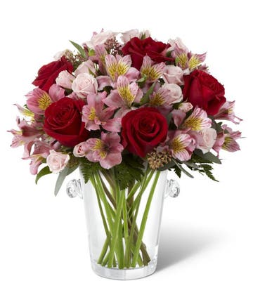 Charm your sweetie with affordable romantic roses in this beautifully hand-arranged red rose bouquet! Send this mixed arrangement of crimson and blush colored rose and carnation blooms to someone dear today and let them know you care. Perfect for any romance, your girlfriend, wife, husband or boyfriend is sure to appreciate your thoughtful gesture. The bright color of these bouquets is further enhanced by lush greenery underneath the gorgeous blossoms. Sending them a symbol of your love has never been so easy - and wonderfully fragrant!