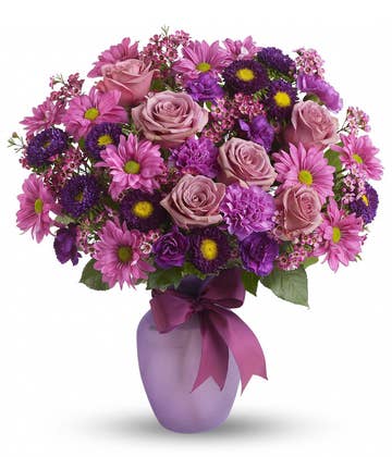 The More Than Words Planter shows your every emotion with a gorgeous floral presentation of elegance and charm. Lavender roses, pink tulips, pink Asiatic lilies, fuchsia carnations, and lavender daisies are lovingly arranged with green mini hydrangea, lush greens, and curly willow tips in a metal oval container to create a wonderful arrangement of breathtaking beauty that your special recipient is sure to adore.