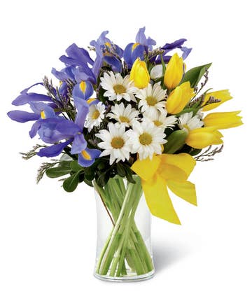 With the Happy Dreams flower bouquet, your recipient can bring springtime beauty indoors, whatever the season! Dark and pastel florals have been very popular this year. Deep violet hued tulip, lilac daisy, and irises are artfully hand arranged to create an elegant burst of spring flowers for someone special, anytime of the year. Fresh-cut blooms are accented with lush greens and presented in a rectangular glass vase, for a centerpiece that delivers your warmest sentiments to someone special. This bargain arrangement is a memorable gift and wonderful display for any room.