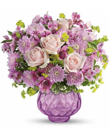 In this luxury dark purple bouquet brilliant light-purple rose, lilac miniature and regular sized carnation, neon-green button pom flowers, and lush greens are beautifully arranged in a designer colored vase. This impressive floral display is amazing at every turn. The arrangement full of mixed light and dark blooms is a wonderful way to express your sweetest sentiments for a sister, birthday, anniversary, and just because occasions. Send this centerpiece to loved ones as soon as today.