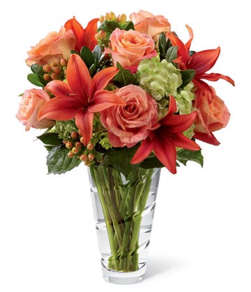 The Forever Fall Bouquet captures the abundant colors of autumn harvest. Charming peach roses, rustic red Asiatic lilies, orange spray roses, and lush greens are carefully hand-arranged in a clear glass vase, creating a stunning display of Fall splendor.