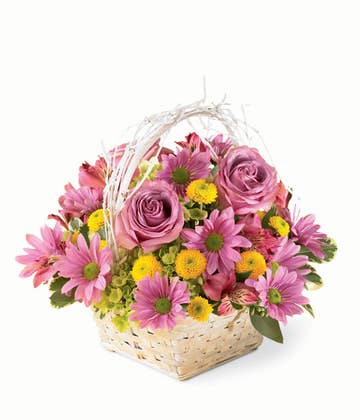 This pretty white basket holds white tulips, pistachio carnations, white mini-Gerbera daisies and a single green cymbidium orchid. Your little Flower Girl will be thrilled to carry her basket down the aisle.Approx. 11H x 12W