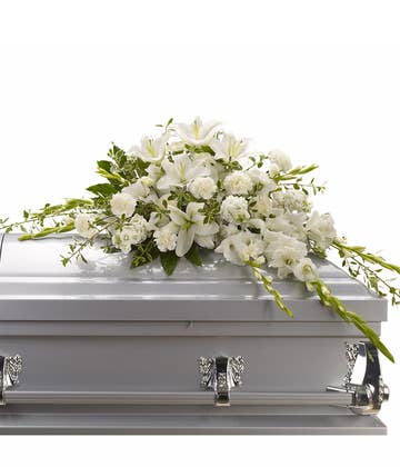 The In Memoriam Casket Spray is a gorgeous symbol of the endless love and faith of the departed. Brilliant white carnations are delicately hand-arranged into the shape of a cross. Accented with lovely white roses and white spray roses in the middle and surrounded by lush greens on the outside, this casket spray brings peace and solace to those that attend the final farewell. Approximately 31"H x 22"W.