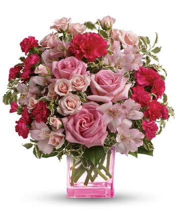 If you're looking for a colorful and vibrant gift to send your loved one, this mixed bouquet is a great for happy birthday, anniversary, and just because present. This cute and romantic feeling arrangement is the perfect choice for any occasion. Hot-pink regular and spray rose buds are combined with violet lisianthus, light-green button pom blooms, and lush greenery to create an unforgettable mixed flowers centerpiece.