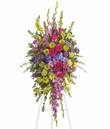 The Parting Prayers Wreath Adornment is a beautiful accent peace that expresses unending affection and love for the deceased. This lovely floral arrangement features stunning lavender carnations, daisies, freesia, and button poms. Accented with vibrant magenta stock, the flowers are carefully hand-arranged to form a wreath that hangs from the side of the casket with a burgundy wire ribbon.
