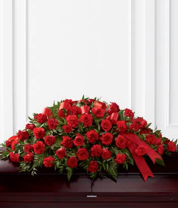 Say your final farewell to a loved one with an exquisite, soft-colored floral casket spray that honors the departed in a magnificent way. A variety of beautiful flowers including coral roses and light pink roses, peach roses, light orange carnations, orange daisies, and light yellow stock conveys your deepest love and devotion in this casket spray. A beautiful funeral flower arrangement to for anyone wishing to pay their respects.
